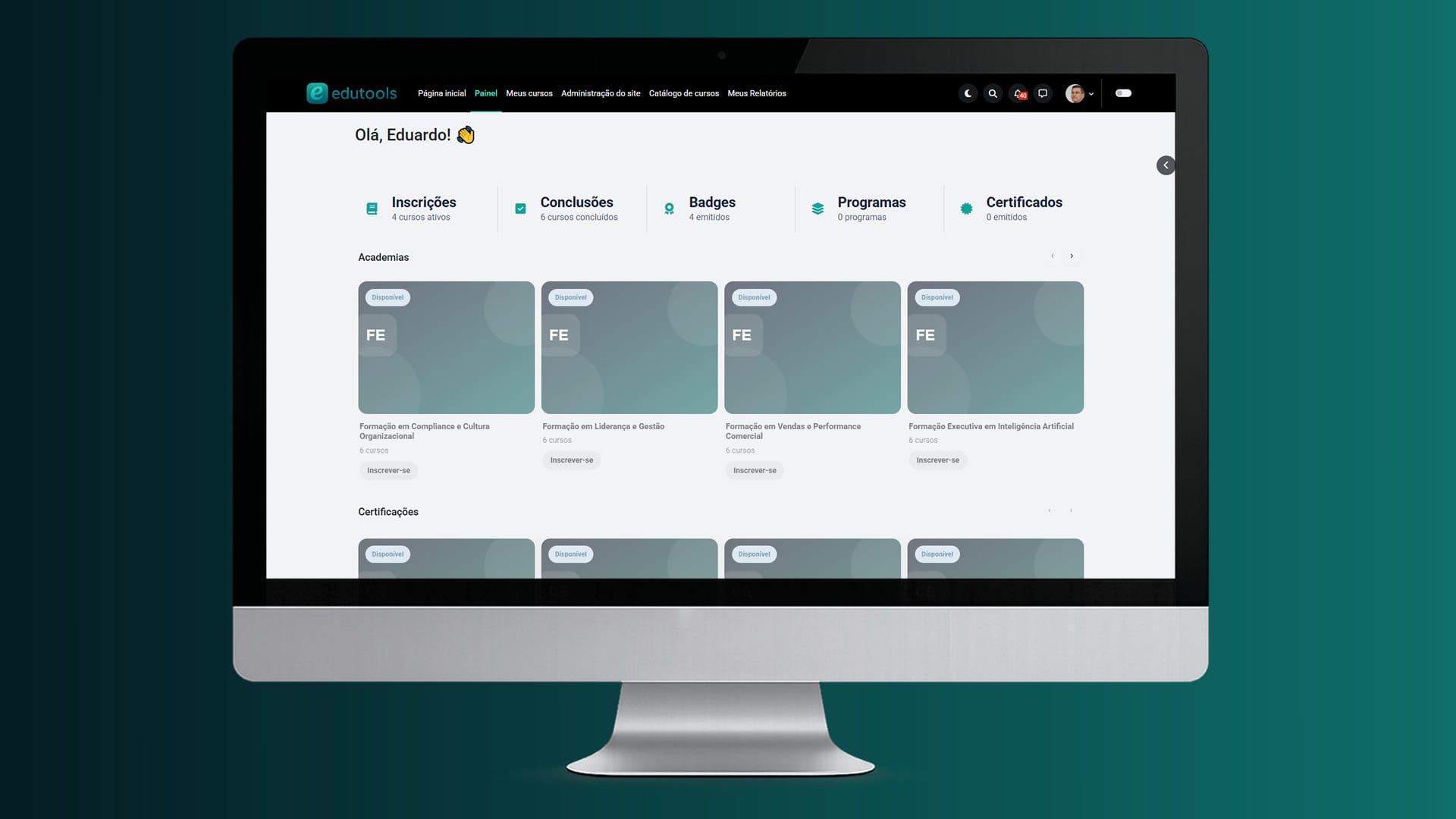 Com o Edutools, o painel passa a ser um ponto estratégico da jornada, destacando progresso, próximos passos e facilitando a continuidade do aprendizado.